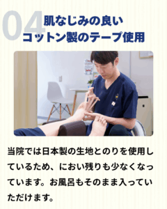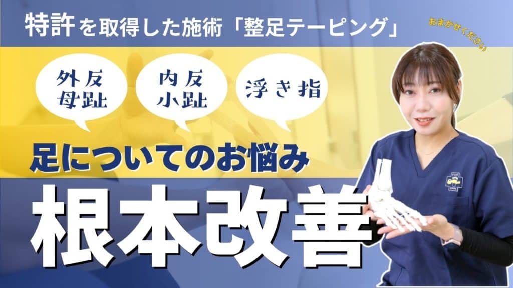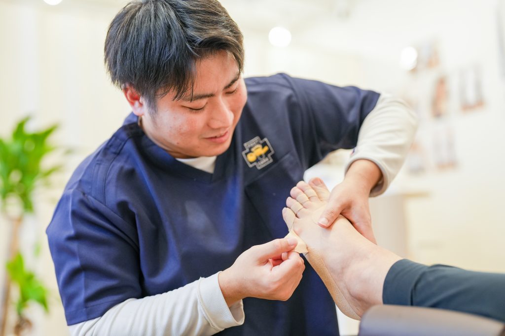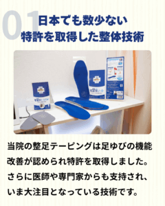 他店舗で経験を積んだスタッフが在籍し、外反母趾・内反小趾・浮き指など幅広い足のお悩みに対応いたします。特許取得の独自テーピング技術で、痛みの原因からしっかり改善!