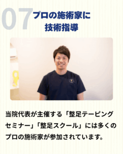 小学校からサッカーを始めて、足の怪我に多く、 中学時代に「浮き指による腰痛(腰椎分離症)」に悩まされました。その当時通った接骨院で「足のテーピング施術」に出会い、症状の軽快・改善と共に、人間の土台となる『足』の重要性を身をもって知ることができました。自分自身の経験から、今この日常が過ぎている瞬間にもたくさんの人が痛み、悩みで困ってます。自分が怪我をしたことでより一層健康という大切さを知り、自分とは状況は違えどそういう人たちの力になりたい。解決したい。何気ないケガから今では自分の人生の思いかけた仕事になりました。